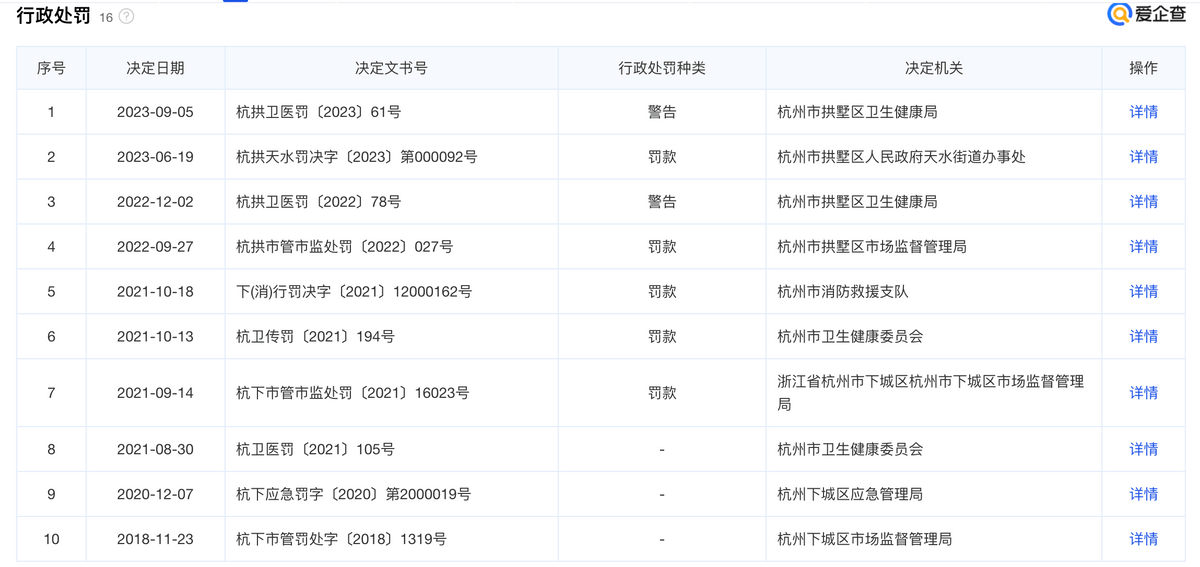 爱企查数据显示,在“杭州米兰柏羽医疗美容医院有限公司”名下,共计有多达16条行政处罚信息,时间跨度从2015年到2023年。