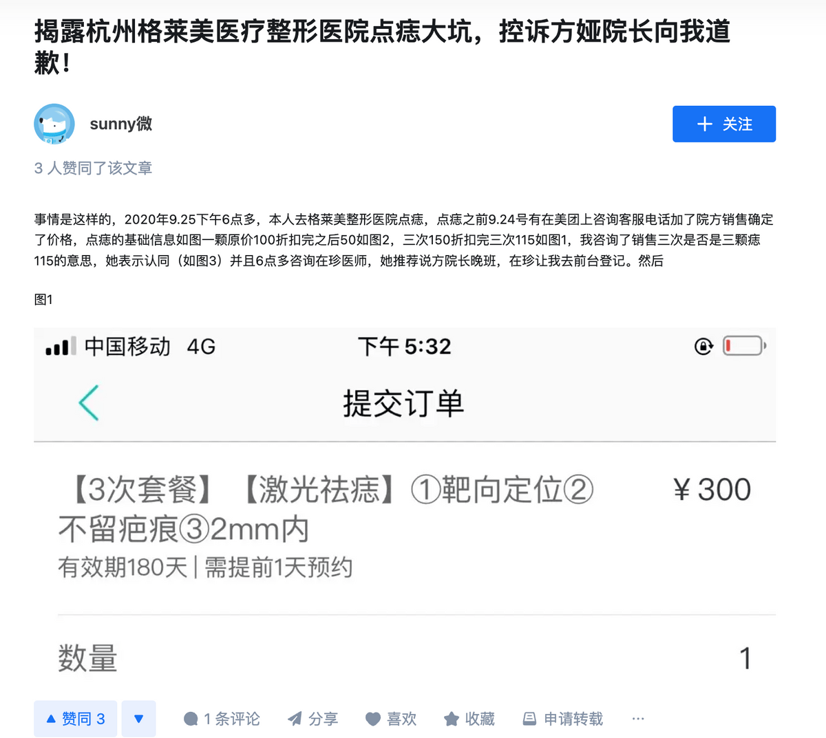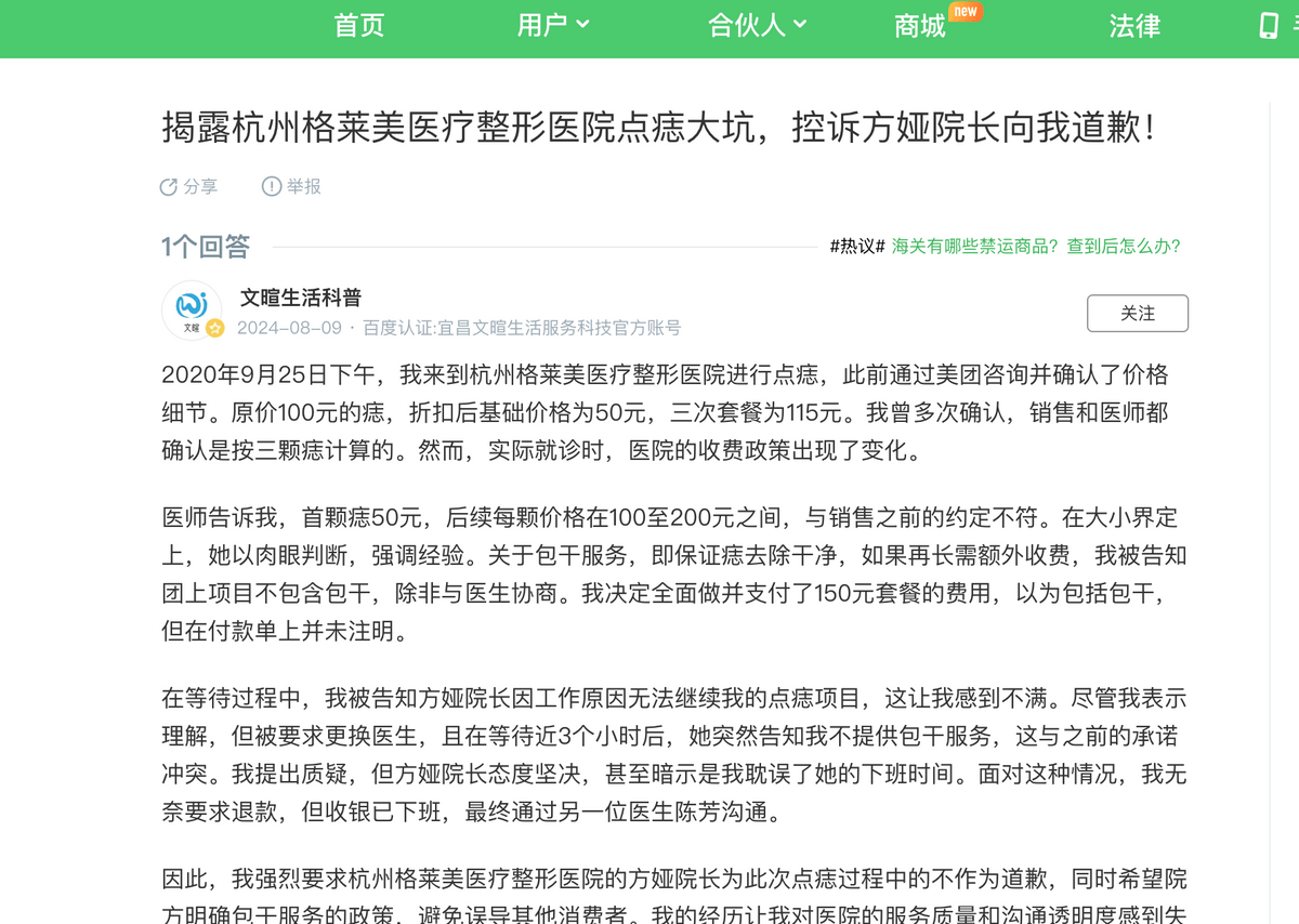 在知乎和百度等平台,一则题为“揭露杭州格莱美医疗整形医院点痣大坑,控诉方娅院长向我道歉!”的帖子十分扎眼。在这篇帖子中,杭州格莱美被指“全程极度傲慢!嚣张!”,“误导消费者上当受骗”。
