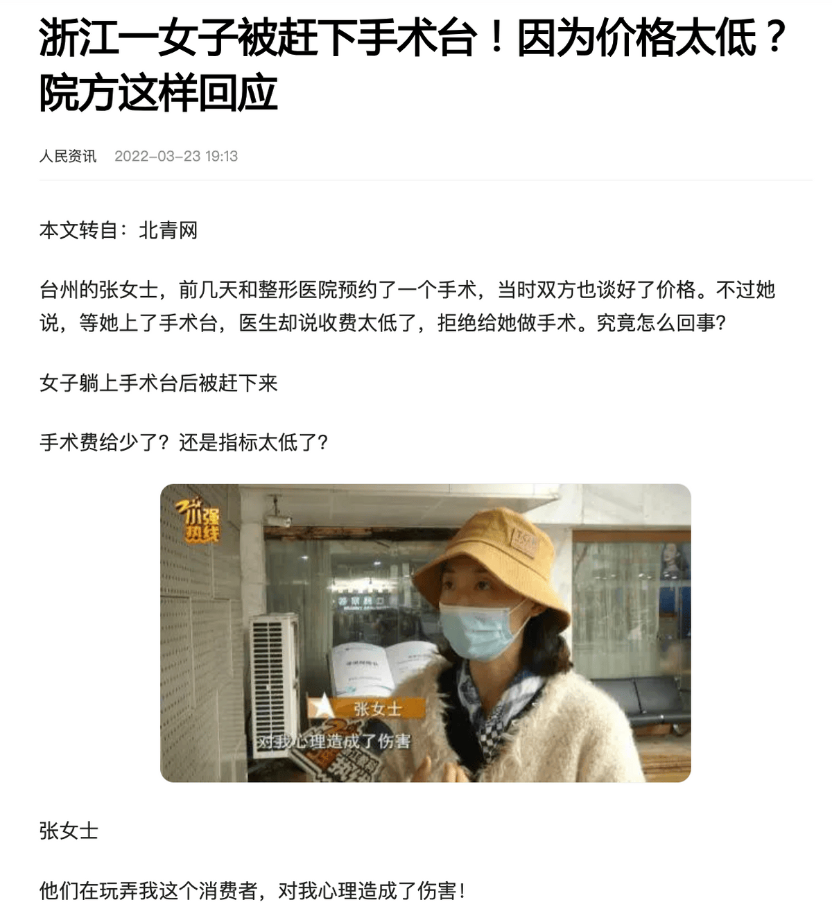 2022年3月,杭州格莱美医疗美容医院成为北青网题为“浙江一女子被赶下手术台!因为价格太低?院方这样回应”报道的主角。