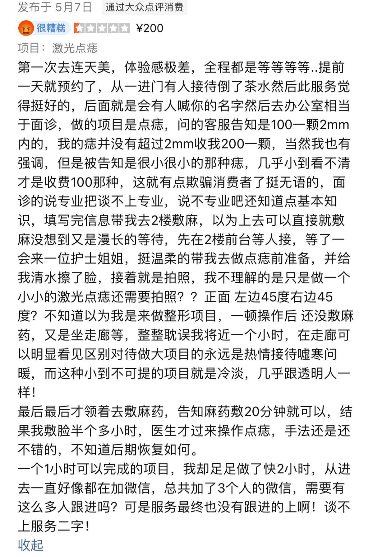 由平台的差评可见,消费者同意的投诉大多在于该机构在各种小项目上非常的不用心,比如这位消费者在该机构体验了激光点痣服务。她提前预约,但到达后还是等了很久。