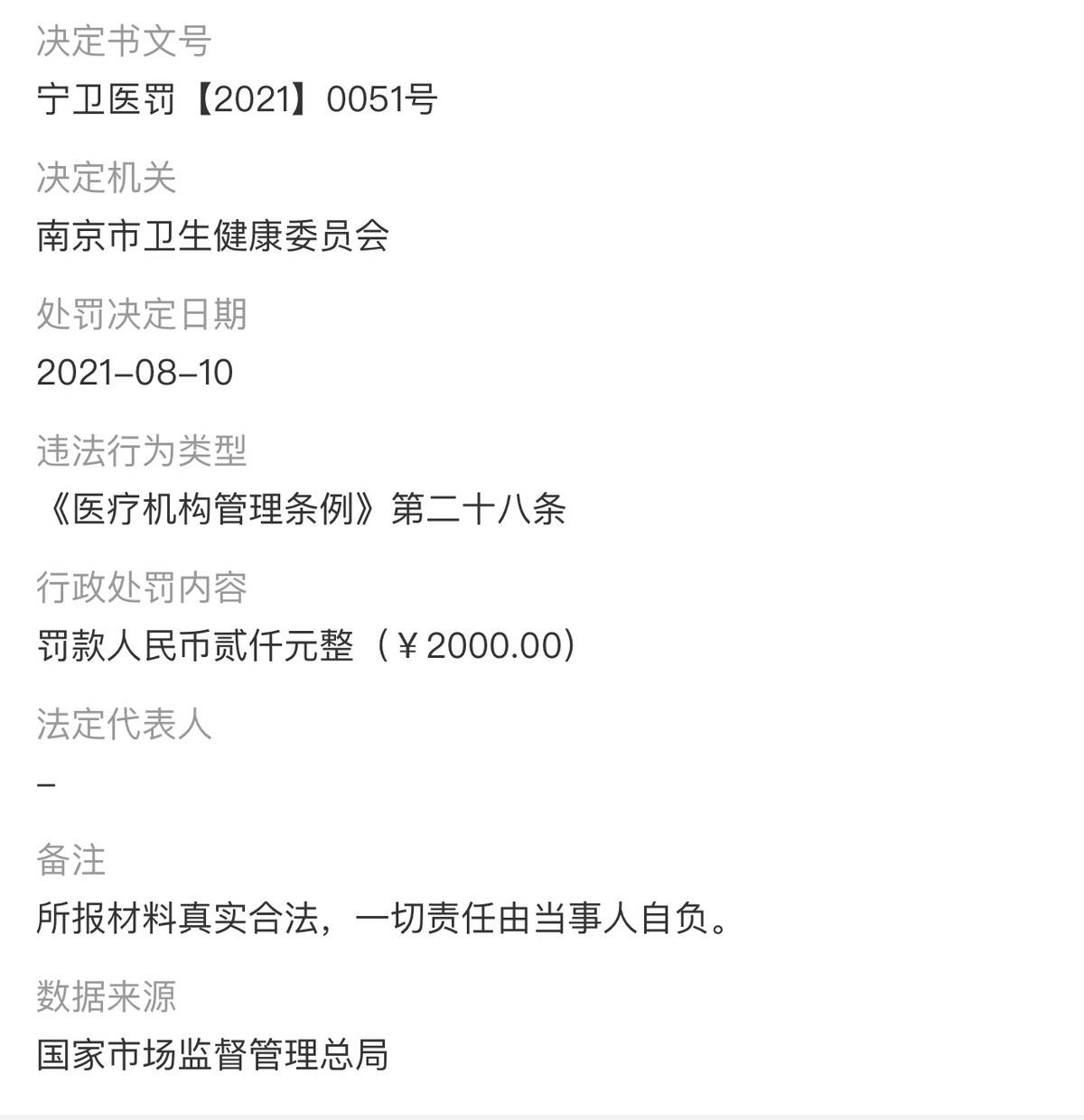 2021年8月10日,南京连天美美容医院有限公司又因违反了《医疗机构管理条例》第二十八条,被南京市卫生健康委员会处以2000元罚款。