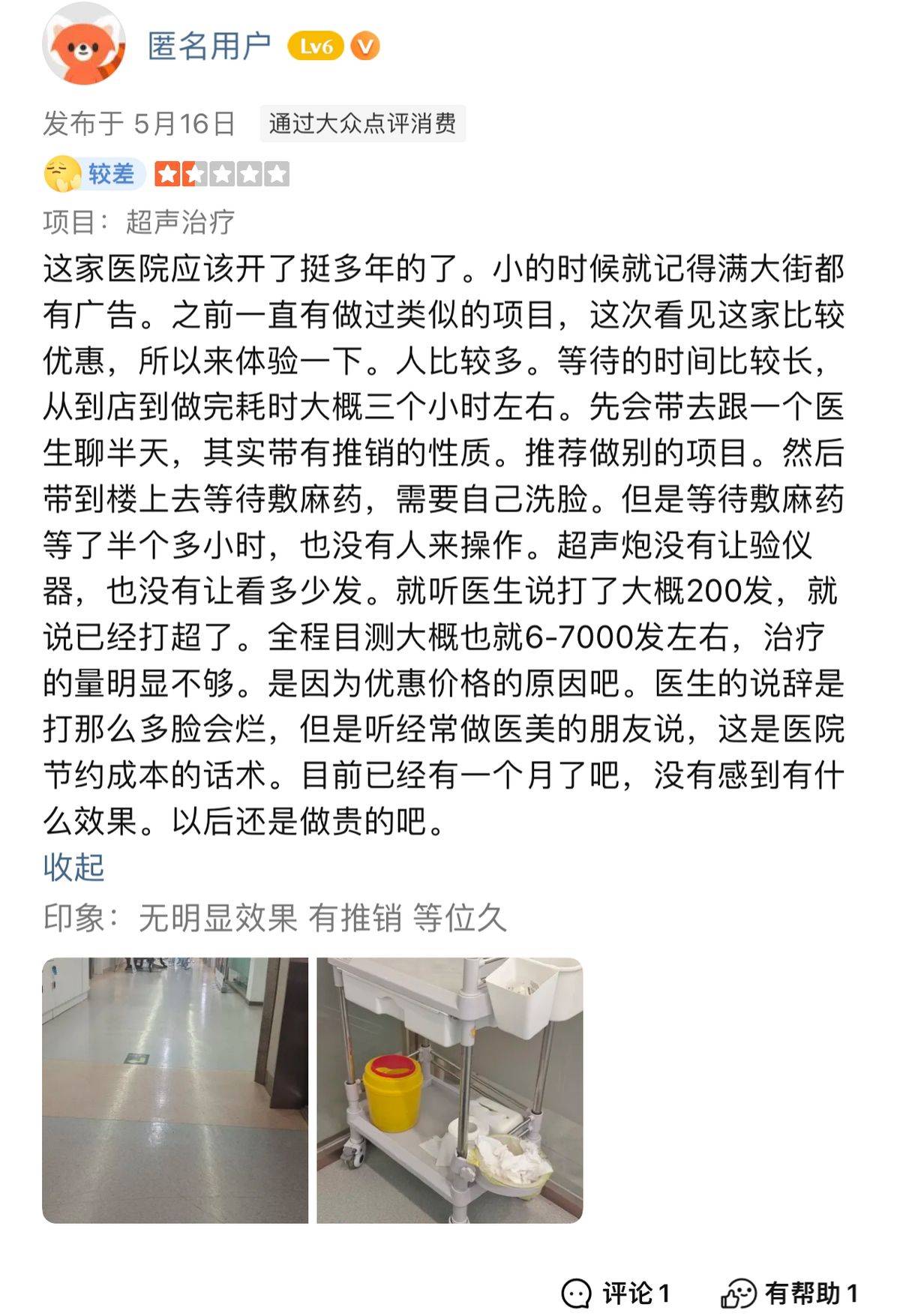 有消费者评价说,她通过大众点评消费,体验了超声治疗。
