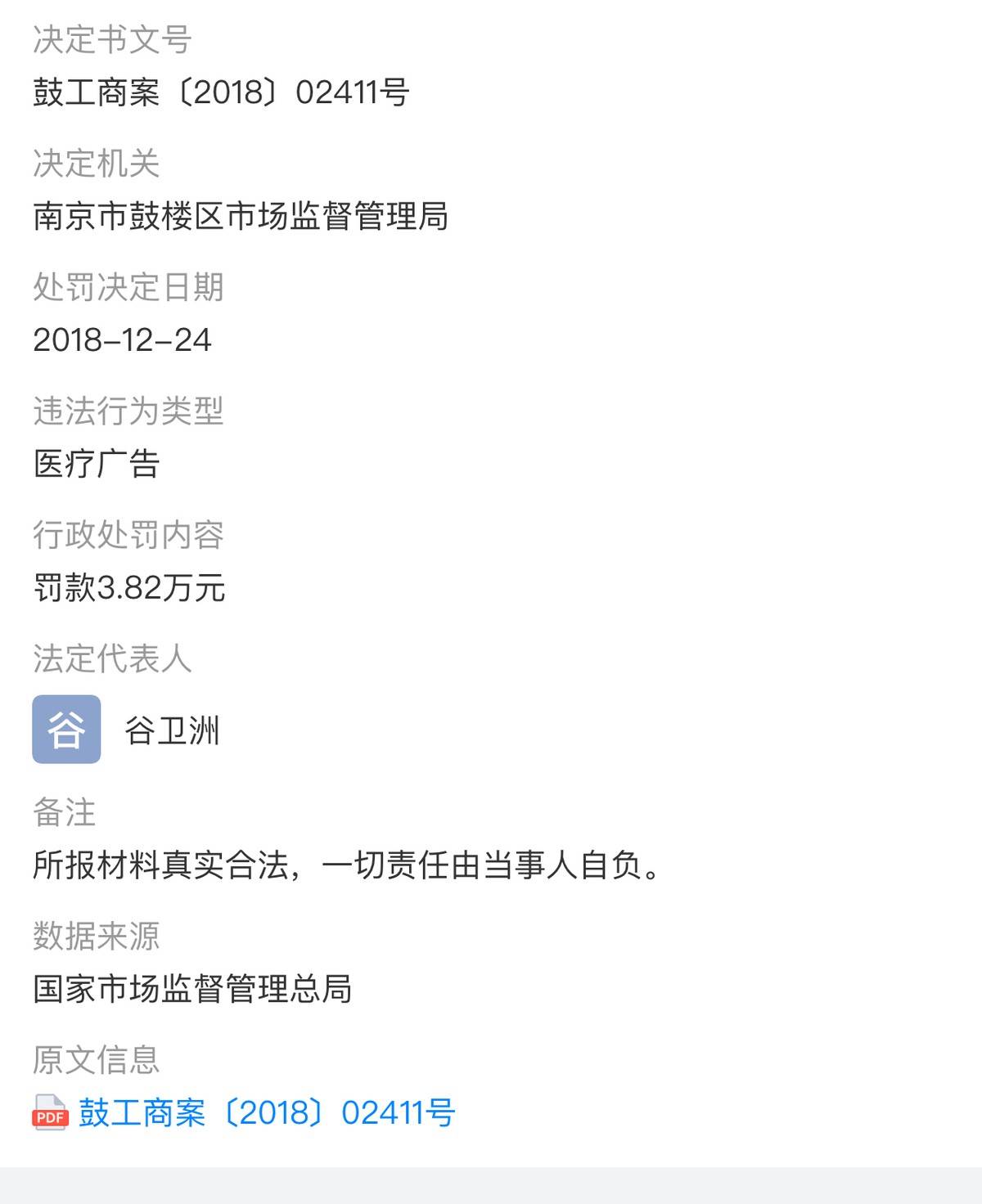 2018年12月24日,南京连天美美容医院有限公司因违规医疗广告,被南京市鼓楼区市场监督管理局处以3.82万元罚款。