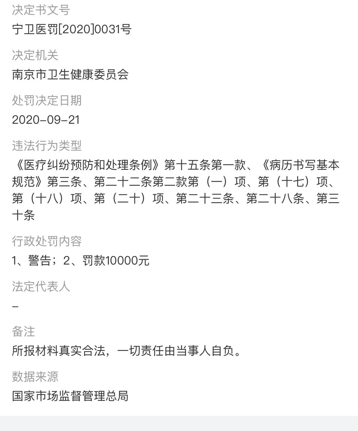 2020年9月21日,南京连天美美容医院有限公司因违反《医疗纠纷预防和处理条例》第十五条第一款、《病历书写基本规范》第三条、第二十二条第二款第(一)项、第(十七)项、第(十八)项、第(二十)项、第二十三条、第二十八条、第三十条,被南京市卫生健康委员会予以警告并处以10000元罚款。