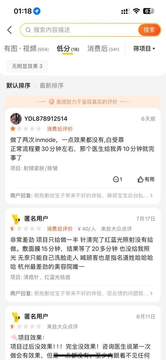 “一点效果都没有,白受罪”,“非常差劲,项目只给做一半…杭州最差劲的美容院唯一”,“项目过后没效果,完全没效果,有点上当受骗的感觉”,“垃圾医院一直推销,面诊高傲的要死不买就不搭理了,服务差的要死不会再来了垃圾”,“做得非常敷衍”,“半年前就被扣码扫过,我打的不是全新的,不确定是否足量”,“9次主动询问进展,一个月了依然没有解释”,“真的没效果,还很贵,还要拿手机写好评”,“这家给我的感觉很不专业”,“这里真的不行,大家避雷,都是亲身体验,太差,真的太差,服务差!技术差!售后也差”。