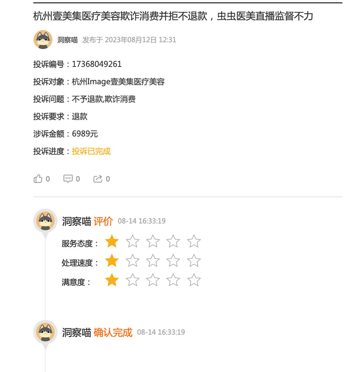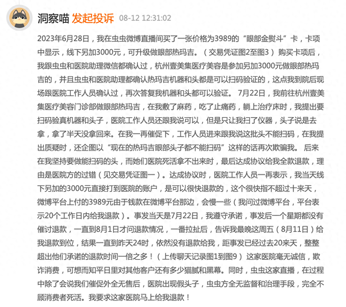 去年八月,某消费者在黑猫投诉上发起了一项题为“杭州壹美集医疗美容欺诈消费并拒不退款,虫虫医美直播监督不力”的投诉。