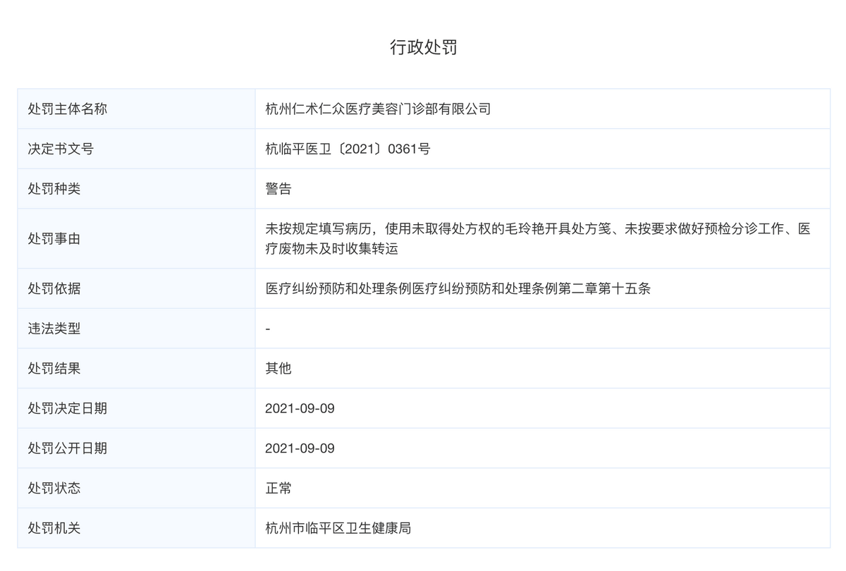 事实上,杭州仁术医美除了因上述大量违法问题遭遇重罚之外,早在2021年9月,他还曾因“未按规定填写病历,使用未取得处方权的毛玲艳开具处方笺、未按要求做好预检分诊工作、医疗废物未及时收集转运”收到杭州市临平区卫生健康局的警告。可惜的是,那一次似乎并未引发该医美机构的足够重视。
