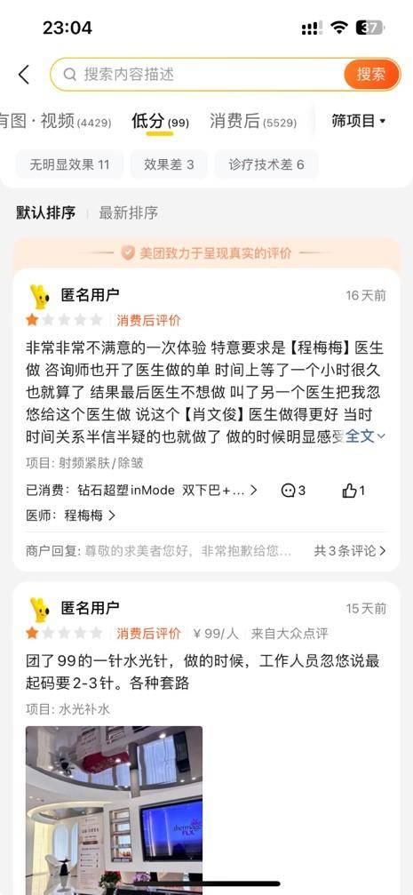 以杭州仁术医美在美团、大众点评平台中的客户评价为例,能够看到最近一段时间以来,有数量众多的消费者都给该医美机构打出了差评。