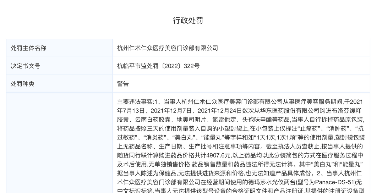 使用劣药、过期医疗器械被罚52万,杭州仁术医美曾违法