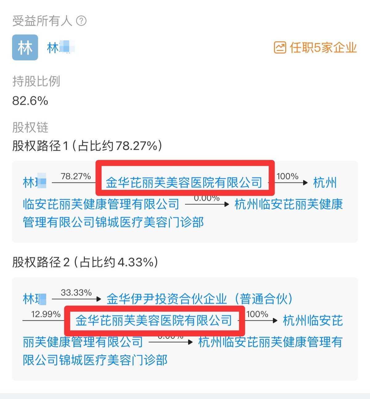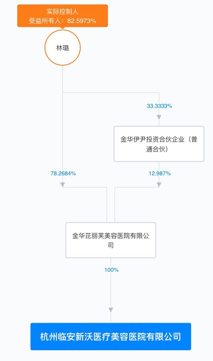 天眼查显示,“新机构”(杭州临安芘丽芙健康管理有限公司锦城医疗美容门诊部)是“杭州临安芘丽芙健康管理有限公司”的子公司,而“杭州临安芘丽芙健康管理有限公司”则由“金华芘丽芙美容医院有限公司”100%控股,实际控制人林某,通过自然人身份与合伙企业“金华伊尹投资合伙企业(普通合伙)”实际控制人的身份,对“金华芘丽芙美容医院有限公司”持股共计82.6%,掌握绝对控制权。