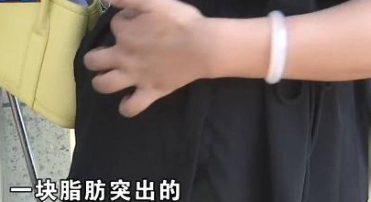 孟女士:腰腹环吸分八个部位,以肚脐眼为中心,上腹下腹、左上腹右下腹这两边,还有这几边是妈妈臀的这些,它就是这一圈是给我吸掉的,但上面是都没有吸的。然后这一边就是很明显,一块脂肪突出的,然后就是腰腹环吸的机器仪器,是三根管子,一根一根一根,肚子表面都是很明显的,包括我现在穿裙子就是这样的,一节一节一节就是这样的。