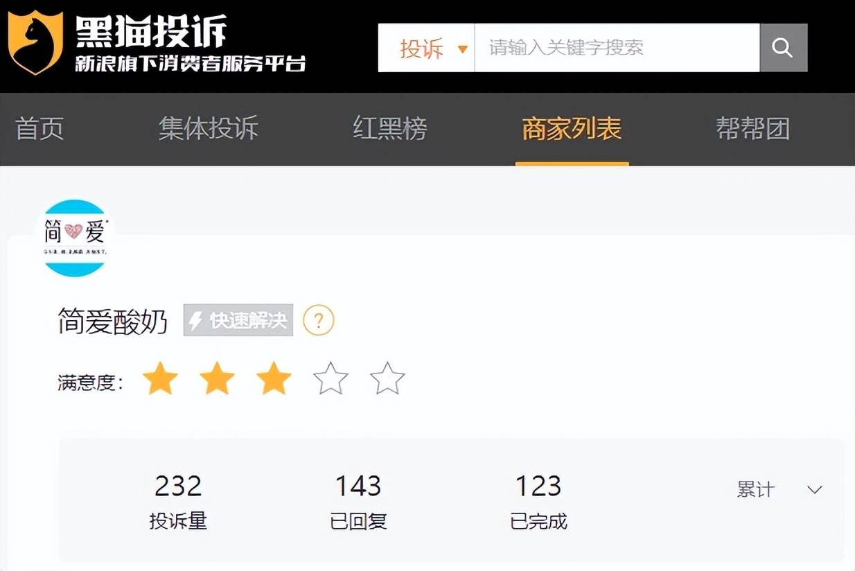 在黑猫投诉平台上,简爱酸奶相关投诉量累计达232条,问题涉及喝出异物、喝完身体不舒服、有异味、保质期内变质等。