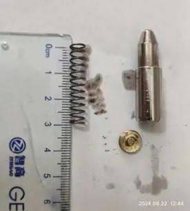 该金属异物长约三厘米,规整地嵌在烤鸡肉中,此时烤鸡已吃了将近一半。取下该异物后,张先生发现,该金属异物顶部有螺纹盖子,可以拧开,里面则是一个弹簧。