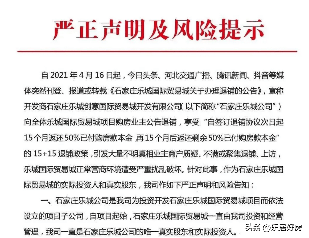 退钱公告第二天,也就是4月16日,一个名为浙江乐城实业集团有限公司的企业发布了《严正声明及风险提示》,声明宣称自己是石家庄乐城国际贸易城的真实股东和唯一投资人,其中指出此次的退租行为是开封兰尉公司以石家庄乐城公司名义发布的退铺公告,既未征得公司股东同意,也未征询大多数业主意见的无权且不合法行为。
