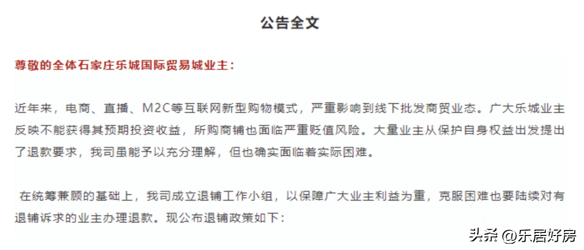 直到2021年4月15日,石家庄乐城国际贸易城忽然发布公告,宣布退钱。