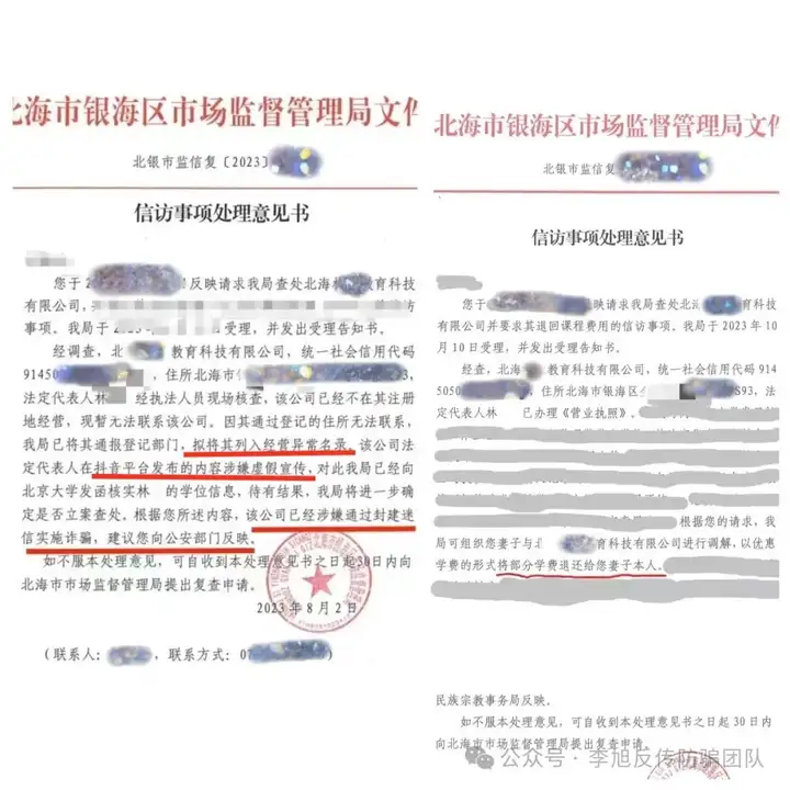 2023年8月,“林某”被北海市银海区市场监督管理局认定虚假宣传,涉嫌通过封建迷信实施诈骗,“林某”的名校学历也在被调查当中。