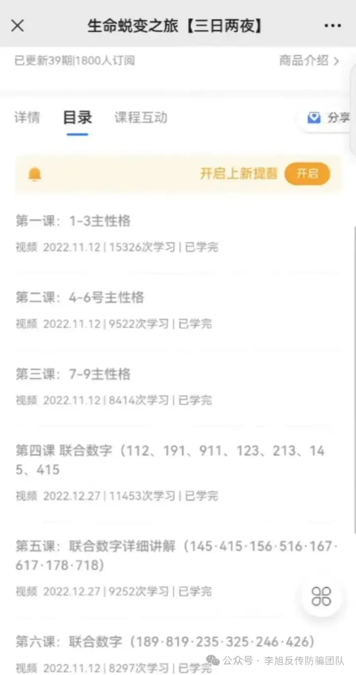 张先生介绍称,这个灵修课程主要以“生命数字密码”、“财富密码”、“高维能量生命之旅”等内容,号称可以让学员认识自己、了解他人、掌握财富,唤醒生命高频能量,创始人“吕某”经常在直播中宣称每个人都有自己的“命盘”和“心图”,了解自己的“生命数字密码”就能够解决生活中的各种问题。