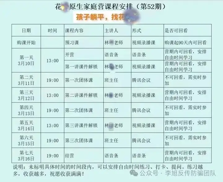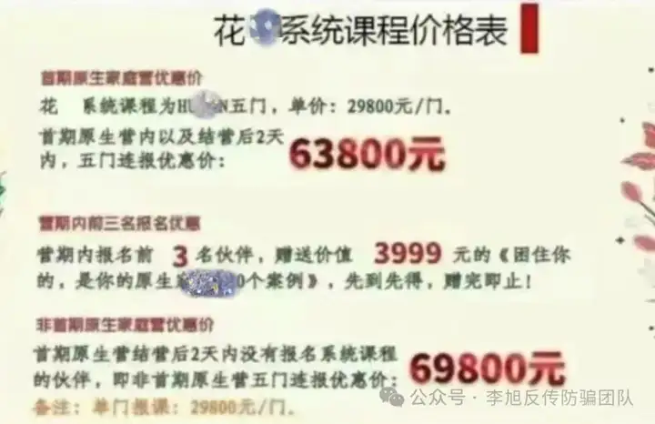 十分担心的赵先生经多番调查,发现“花某原生家庭”的课程学费不但十分高昂,学员还会被“老师”诱导,层层递进。先是购买999元课程简单学习,随后就会被要求继续购买6万元的课程进行下一环节。
