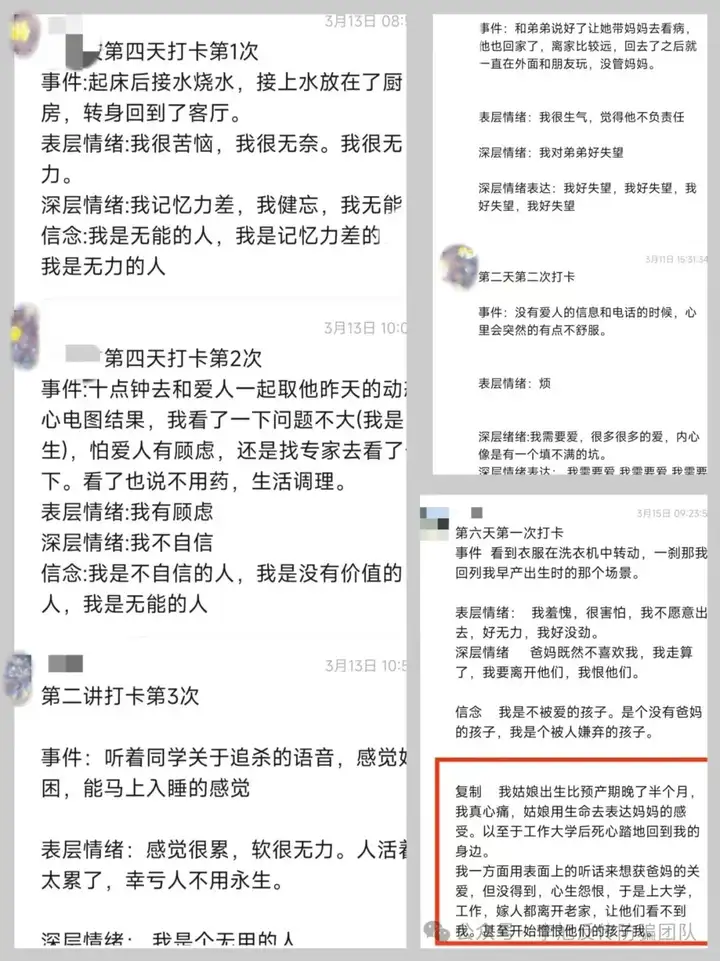 在赵先生提供的资料中可以发现,该课程是以原生家庭为“痛点”的,学员会在一次次的打卡练习中,将身上的所有不足归结在原生家庭里,甚至会产生仇视亲人的思想。