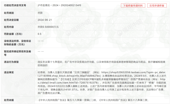 今年3月份,贝泰妮旗下的贝芙汀旗舰店,在网店平台销售化妆品的经营活动中,在销售标题为“【红包痘】贝芙汀2号祛痘CP精华凝乳水杨酸果酸瘪痘修复祛红”的国产普通化妆品,在其广告宣传页面商品标题一栏使用了“修复”功能的宣传用语。