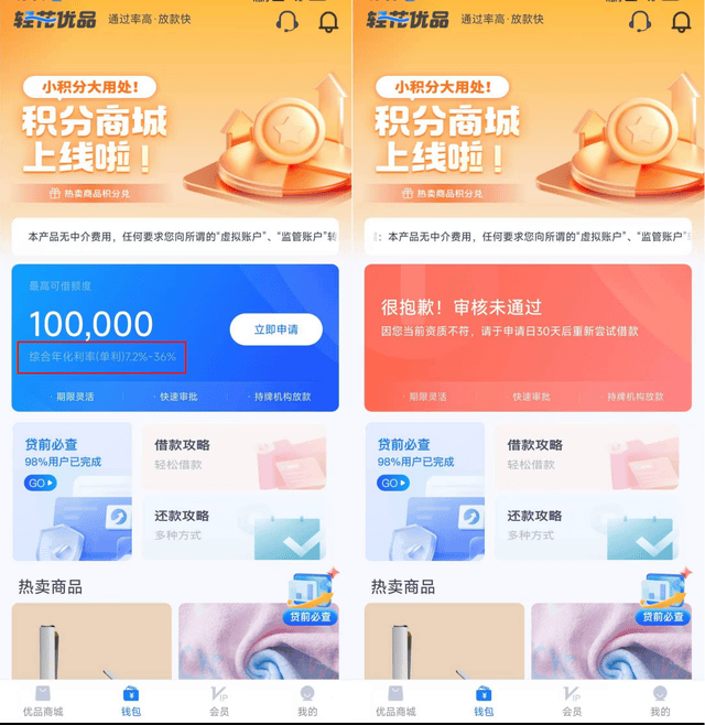 开甲财经下载、注册,并尝试在轻花优品APP-钱包申请额度提示“审核未通过”,但在申请额度之前,轻花优品APP-钱包页面显示:最高可借10万元,综合年化利率7.2%-36%。