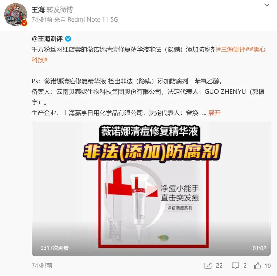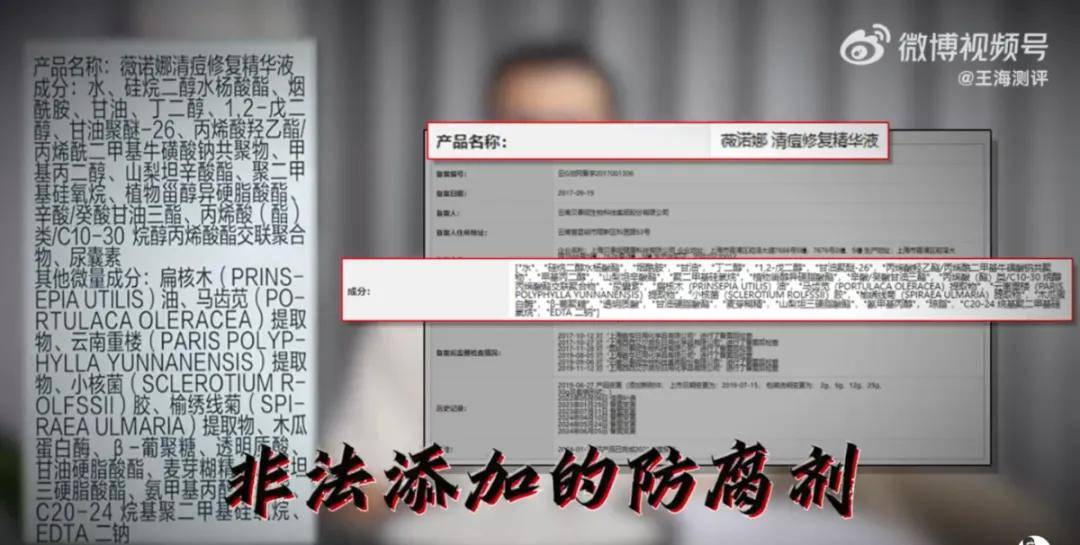昨日,知名打假人王海及其名下的王海测评账号发布了一则视频,直指薇诺娜品牌的一款“薇诺娜清痘修复精华液”涉嫌非法(隐瞒)添加防腐剂。