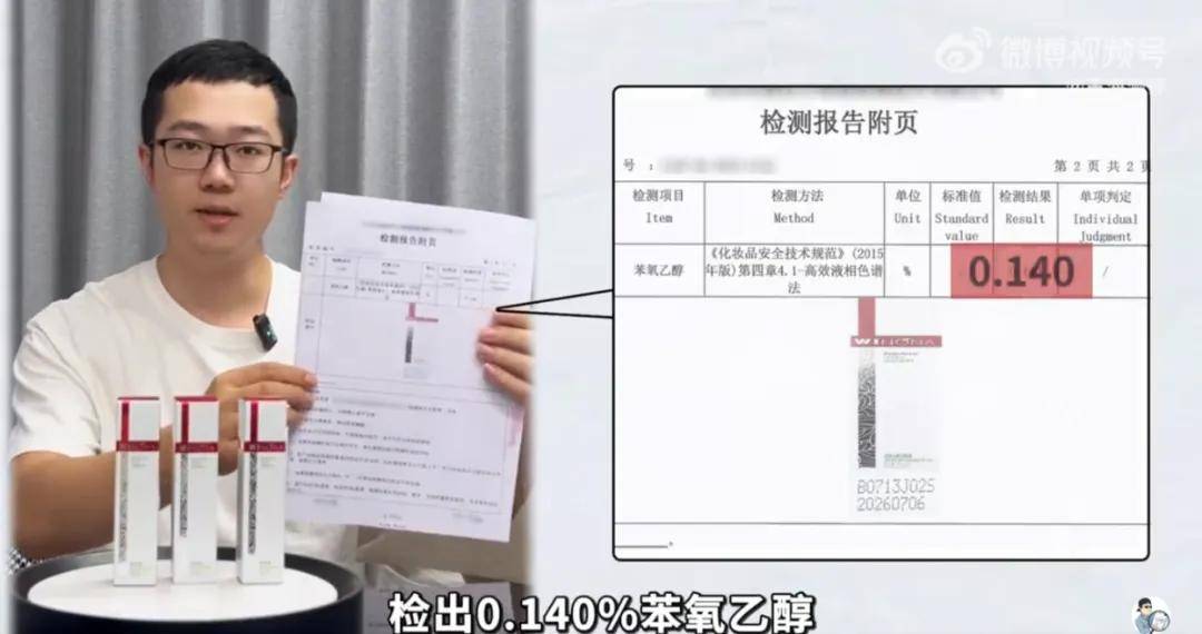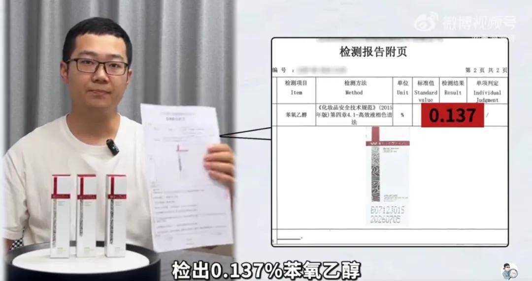 王海测评发布的视频内容显示,从薇诺娜天猫、拼多多、京东官方旗舰店分别购得的“薇诺娜清痘修复精华液”产品中,均检出了未在成分表标识且超出备案范围的防腐剂:苯氧乙醇,添加量在0.137%-0.140%之间。