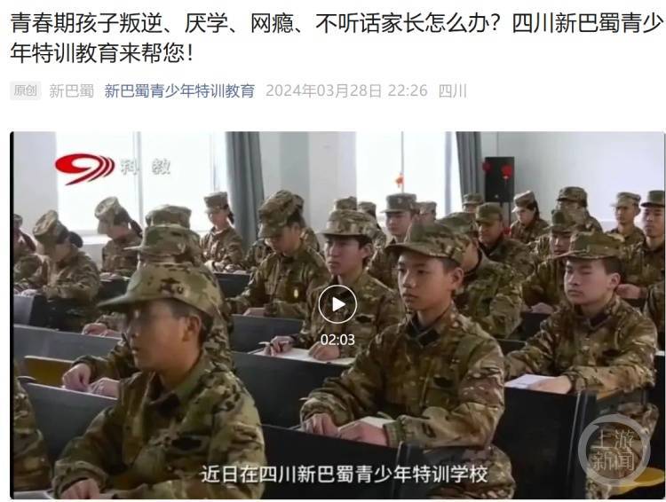 四川新巴蜀特训营学校官微上介绍,该校是一所青少年心理行为矫正学校,针对全国8岁-18岁的早恋、沉迷游戏、厌学、叛逆、懒惰、亲情淡漠、离家出走、自控能力差等不良习惯的青少年进行心理辅导、军事训练、感恩教育、行为习惯矫正、思想教育、法制教育等。对学员进行全封闭式军事化管理,通过有针对性的系统化训练,改变他们的不良习惯……