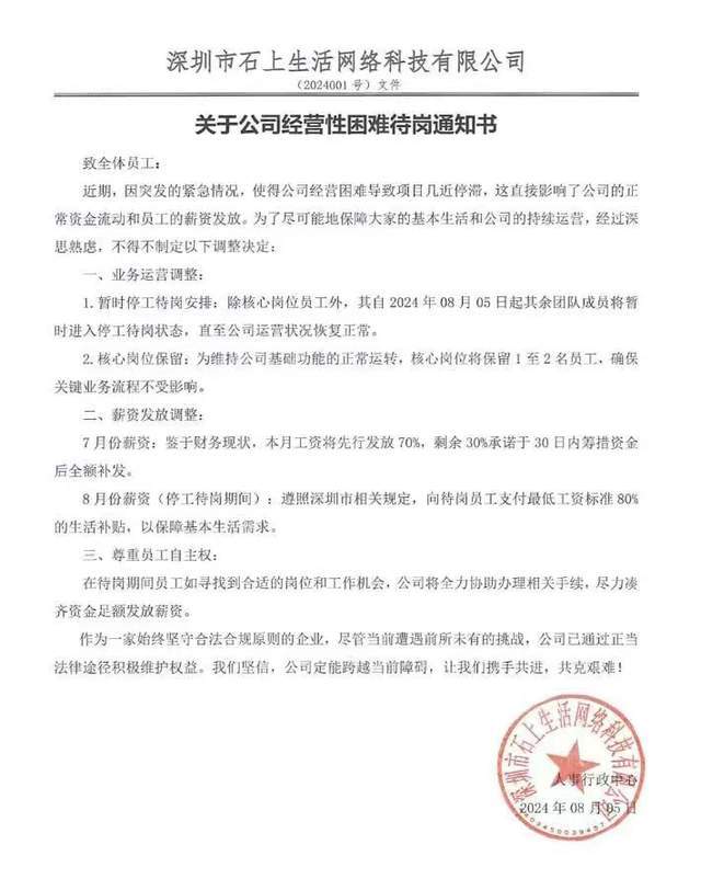 时隔十余天后,8月5日,石上生活发出《关于公司经营性困难待岗通知书》称,为尽可能保障员工的基本生活和公司的持续运营,“除核心岗位员工外,自2024年8月5日起其余团队成员将暂时进入停工待岗状态,直至公司运营状况恢复正常”,待岗期间,公司将向员工支付深圳市规定的最低工资标准的80%以作生活补贴,并在通知书最后表示待岗员工可另谋出路。