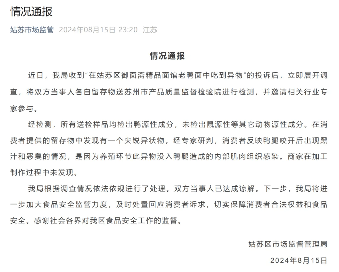 通报表示,近日,姑苏区市场监督管理局收到“在姑苏区御面斋精品面馆老鸭面中吃到异物”的投诉后,立即展开调查,将双方当事人各自留存物送到苏州市产品质量监督检验院进行检测,并邀请相关行业专家参与。