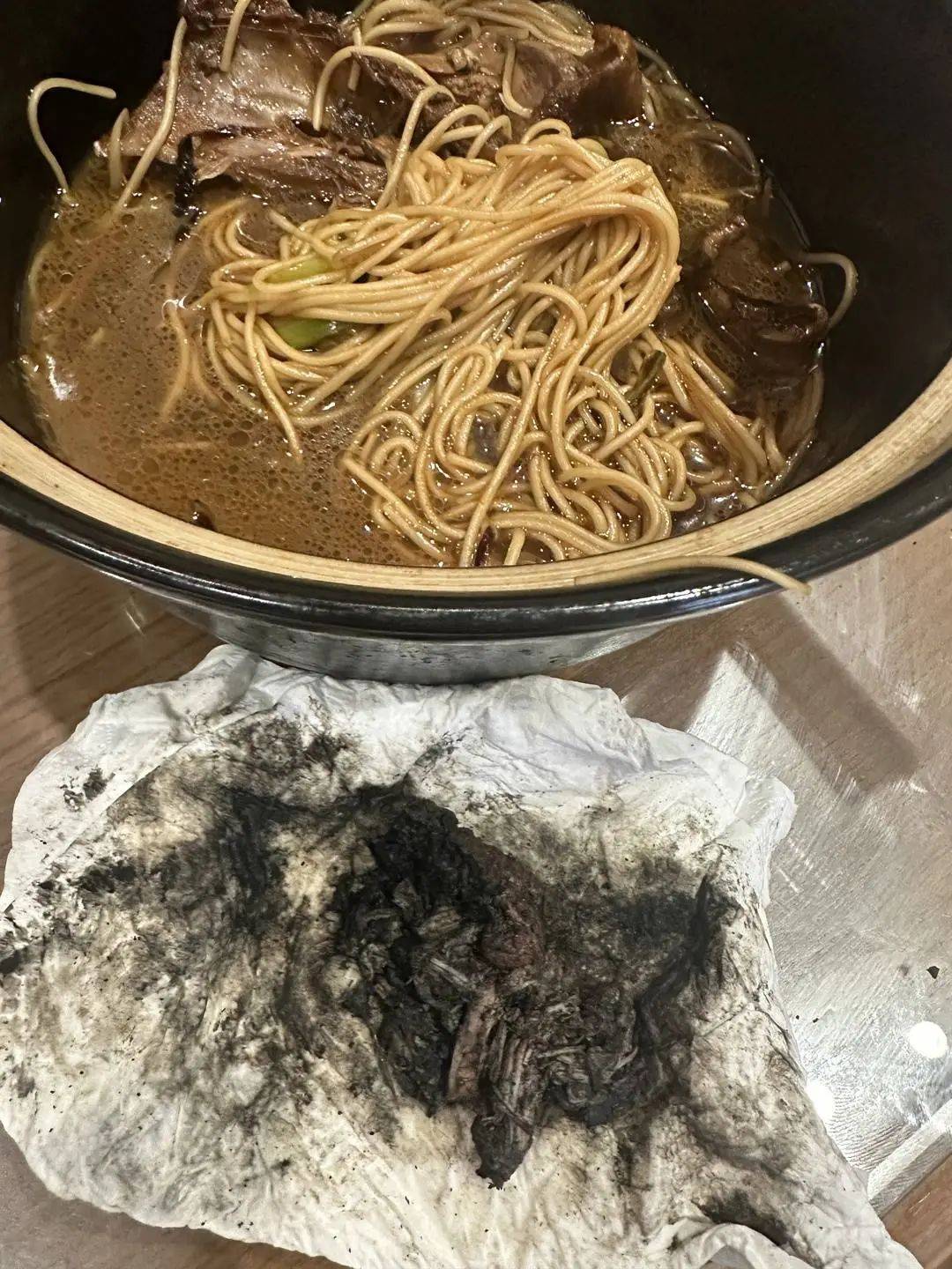 他点的是166元的老鸭面,吃到三分之一时,咬到了一块类似鸭肉的东西,当时他 未看出异样,咬开后有黑汁冒出,且伴有浓烈的臭味。