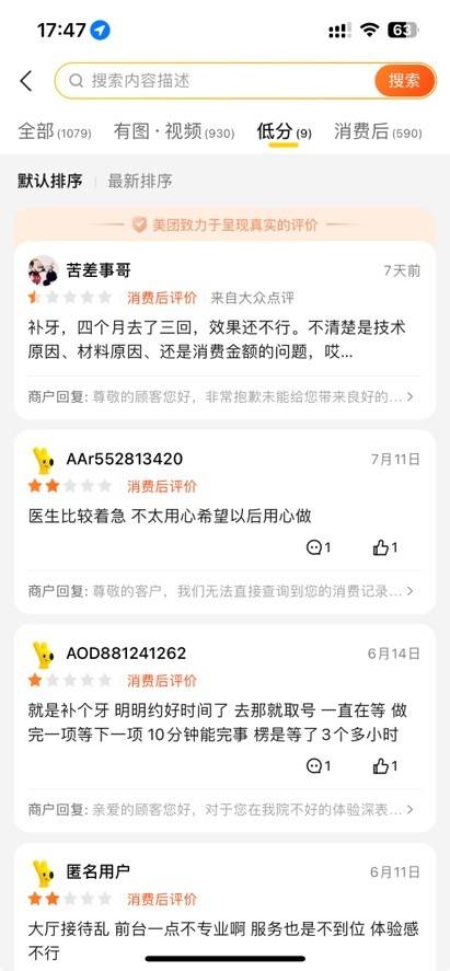 值得注意的是,在美团、大众点评等平台,沈阳德立联合口腔医院也遭受了一些消费者的质疑。