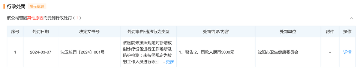 今年3月,沈阳市卫生健康委员会发布的一份行政处罚信息(沈卫放罚〔2024〕001号)显示,沈阳德立联合口腔医院有限公司“未按照规定对新增放射诊疗设备进行工作场所及防护检测;未按照规定为放射工作人员进行职业健康检查和个人剂量检测”。