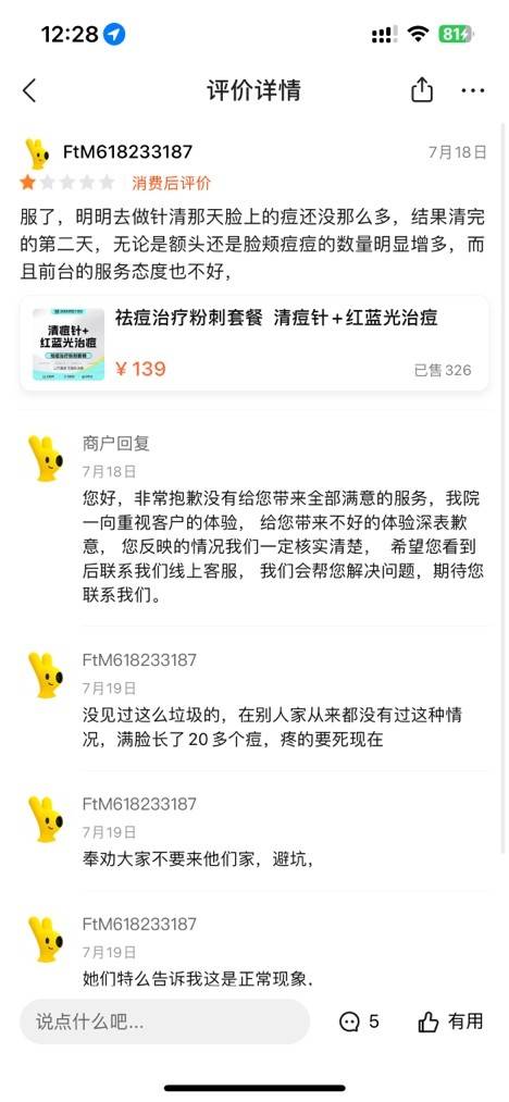 但是,消费者体验完之后却表示,“服了,明明去做针清那天脸上的痘还没那么多,结果清完的第二天,无论是额头还是脸颊痘痘的数量明显增多,而且前台的服务态度也不好”。