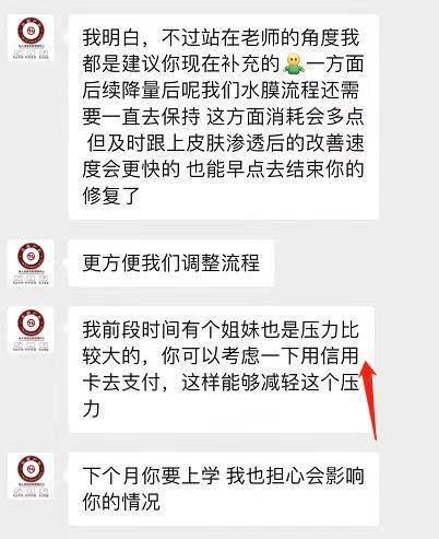 这类“连环推销套路”往往打着“效果显著”的旗号,要求消费者大量购买、加量使用,使用无效后再推销其他产品进行修复。在消费者表示资金紧张后,会建议、引导消费者通过借贷平台分期购买。