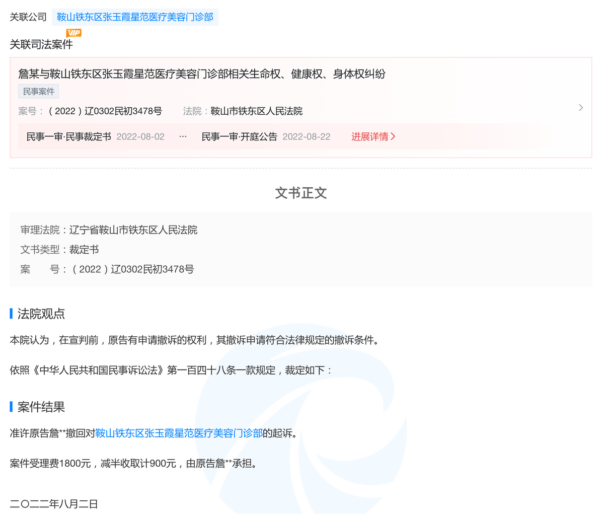 此外,鞍山张玉霞星范整形还曾因生命权、健康权、身体权纠纷被消费者起诉至法院。