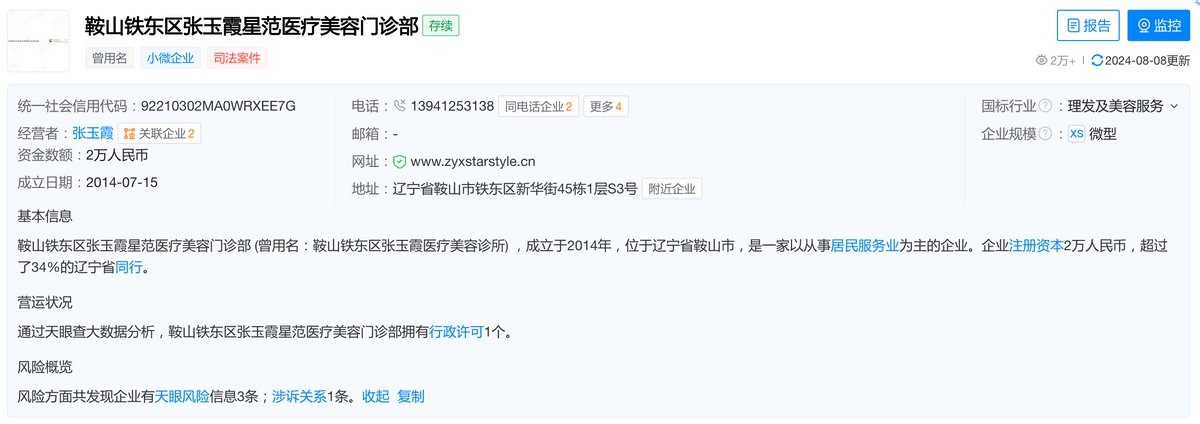 考虑到注册资本是公司承担民事责任的上限,当公司面临债务纠纷或法律责任时,注册资本的数额决定了公司的赔偿能力和责任范围,若消费者真的被医美机构侵犯了合法权益,那么至少从目前鞍山张玉霞星范整形情况看,他很难为消费者“兜底”。