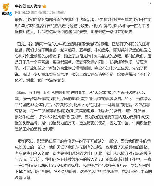9月5日,牛约堡通过官方微博承认问题所在,并表示已在改进。同时表示,将对门店形象进行全面升级。合同即将到期且从未进行过形象升级的老加盟商,在合同到期前,按照其最新版的标准形象进行统一升级。