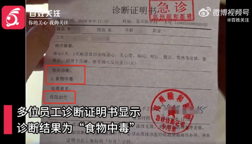 多位员工诊断证明书显示,诊断结果为“食物中毒”。王女士称,事后店方只愿意赔偿900多元餐费,医院已上报卫健委,正在等待调查结果。