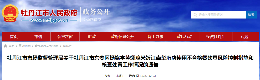 2023年2月23日,黑龙江省牡丹江市市场监督管理局发布关于牡丹江市东安区杨铭宇黄焖鸡米饭江南华府店使用不合格餐饮具风险控制措施和核查处置工作情况的通告。