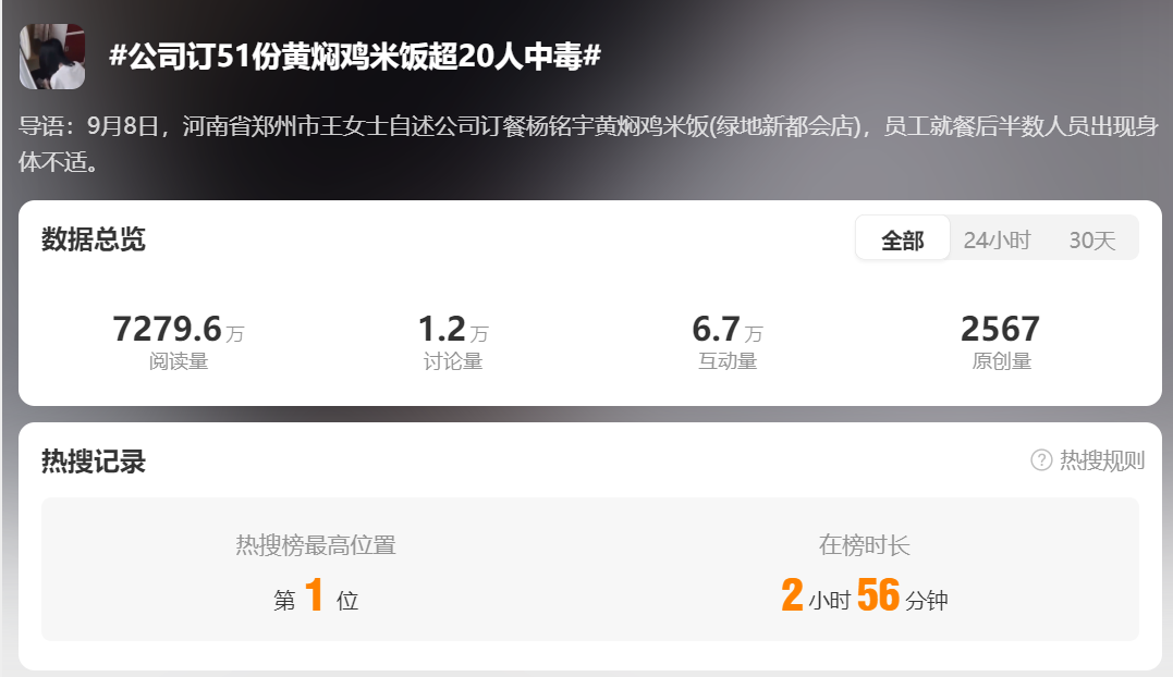 9月9日,“公司订51份黄焖鸡米饭超20人中毒”冲上微博热搜第一。