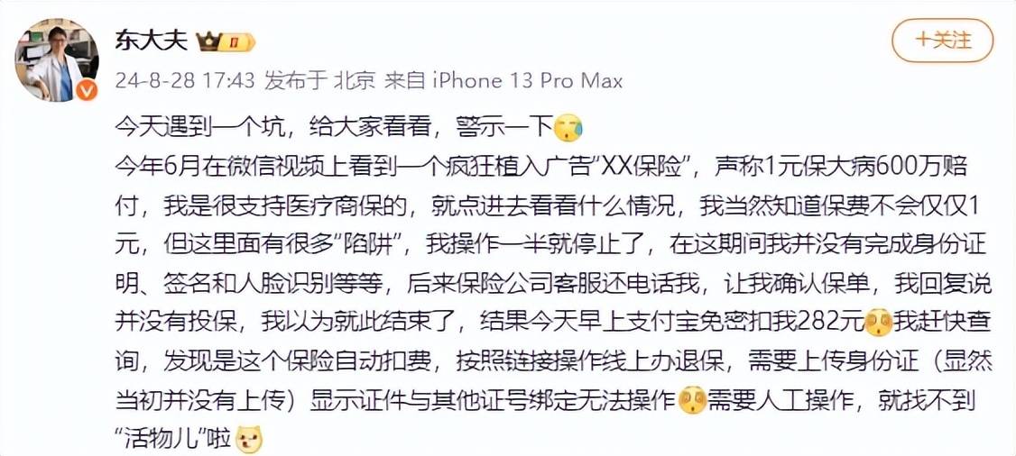 据张大夫微博,今年6月张大夫在微信视频上看到一个疯狂植入广告“XX保险”,声称1元保大病600万赔付。