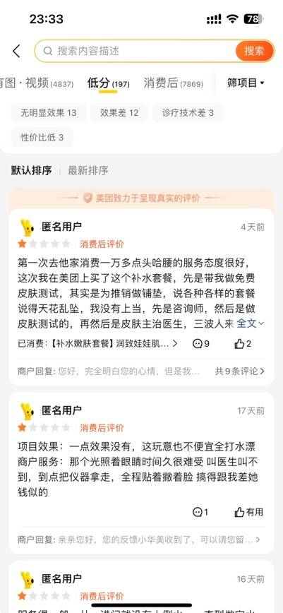 从美团、大众点评等网络消费平台中也能够发现,近期关于合肥华美整形外科医院的低分评价呈多发态势。