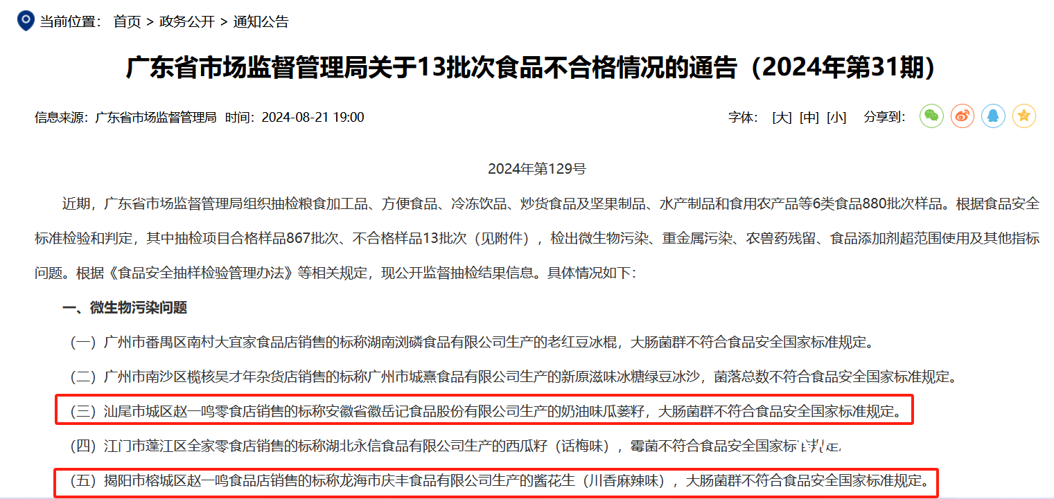 具体来看,汕尾市城区赵一鸣零食店销售的标称安徽省徽岳记食品股份有限公司生产的奶油味瓜蒌籽、揭阳市榕城区赵一鸣食品店销售的标称龙海市庆丰食品有限公司生产的酱花生(川香麻辣味),这2批次样品都被检出大肠菌群超标。