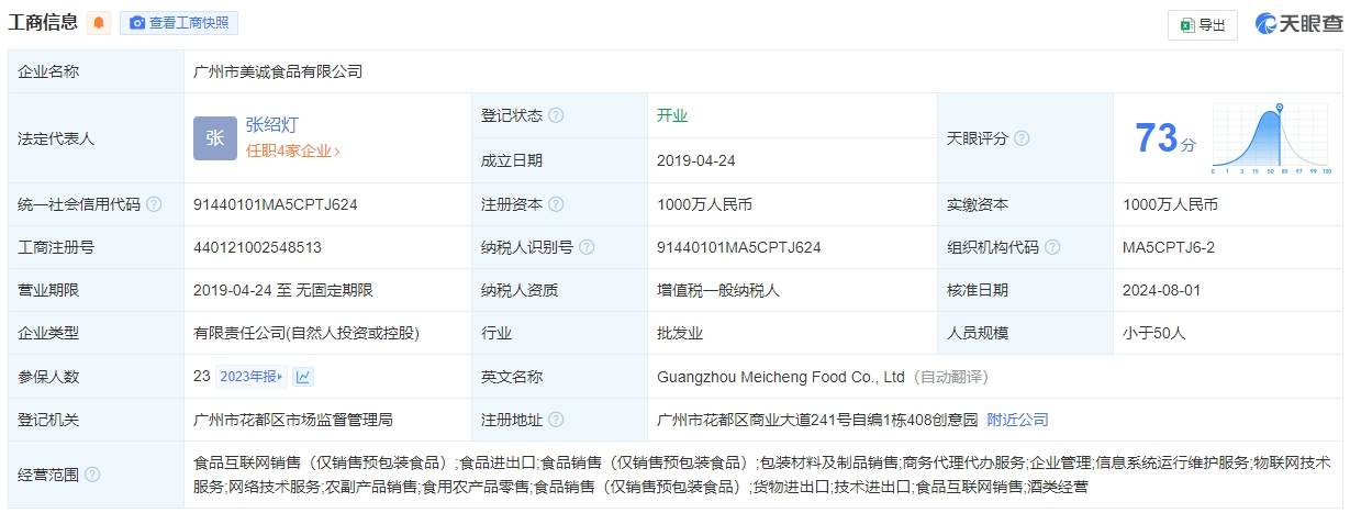 天眼查显示,广州市美诚食品有限公司成立于2019年4月,注册资本1000万元,法定代表人、经理、董事均为张绍灯,由张绍主、张绍灯2名自然人共同持股。