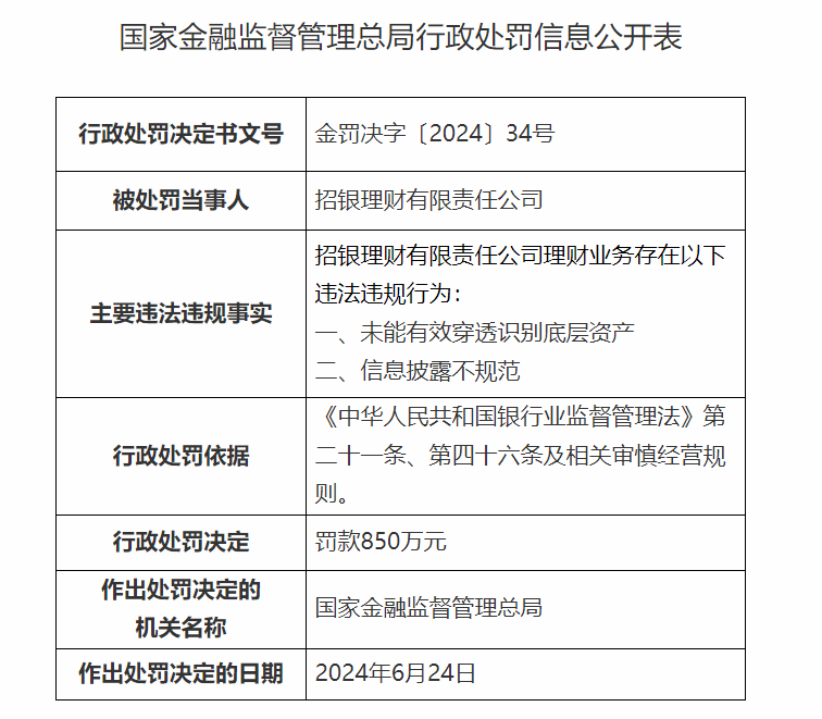 需要特别注意的,6月下旬,招商银行理财业务因“未能有效穿透识别底层资产、信息披露不规范”,被国家金融监督管理总局处以350万元的行政处罚。同一天,招银理财有限责任公司也因同样的原因被罚款850万元。