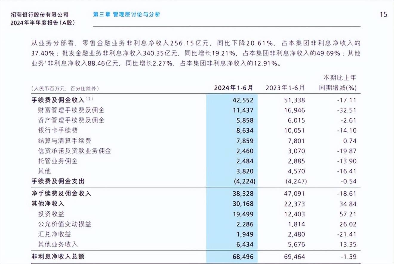 非息收入的疲态,体现在手续费和基金佣金等招商银行传统优势项目业绩失色。上半年,招商银行净手续费及佣金收入383.28亿元,同比下降18.61%;其中占比最多的财富管理手续费及佣金收入114.37亿元,也是下降幅度最大的一项,同比下滑了32.51%。
