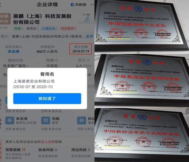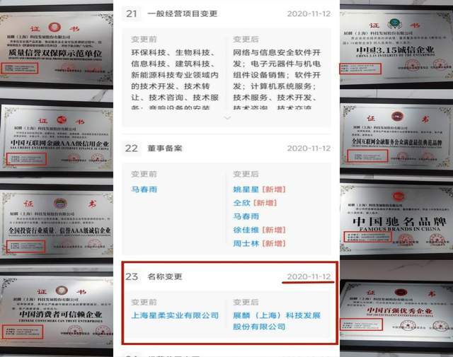 展麟科技南京职场墙上悬挂的“质量信誉双保障示范单位”、“中国互联网金融AAA级信用企业”、“全国投资行业质量、信誉AAA级诚信企业”、“中国消费者可信赖企业”、“中国3.15诚信企业”、“全国互联网金融服务公众满意最佳典范品牌”、“中国驰名品牌”、“中国百强优秀企业”这9块荣誉牌的起始时间都是2020年7月,而展麟(上海)科技发展股份有限公司于2020年11月12日之前的公司名称是上海星柔实业有限公司,很显然这些荣誉也是“早产”的。