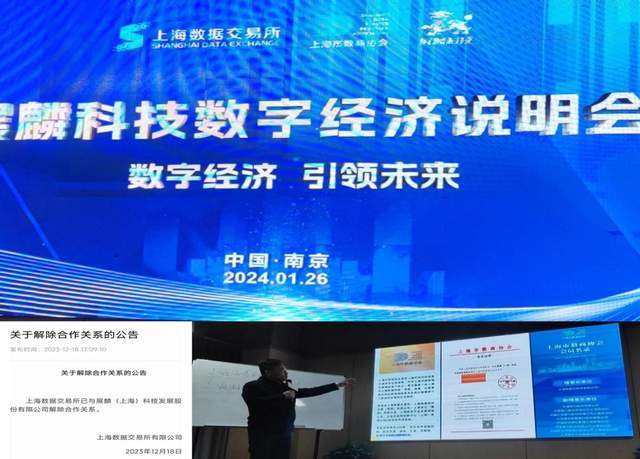 2024年1月26日,记者受邀参加展麟科技数字经济说明会。会上,自称是展麟科技执行董事王清的人,大肆宣传展麟(上海)科技发展股份有限公司是上海数据交易所的会员单位。记者从上海数据交易所官网了解到,早在2023年12月18日,上海数据交易所就发布了《关于解除合作关系的公告》,公告载明:上海数据交易所已于展麟(上海)科技发展股份有限公司解除合作关系。
