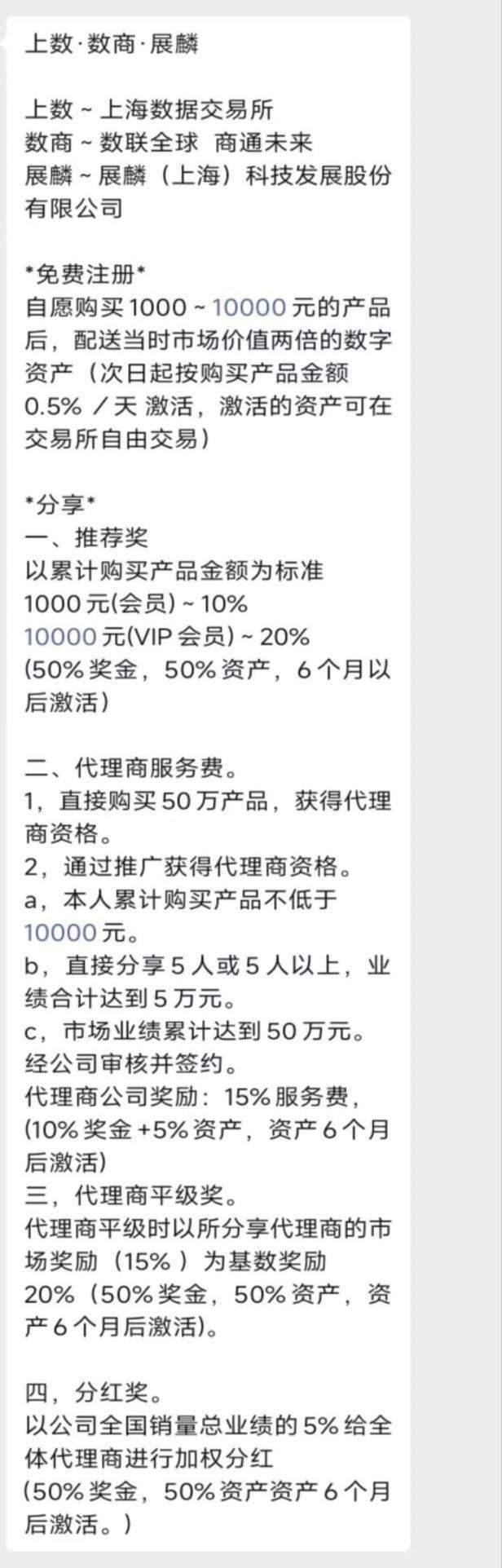 记者从投资人处了解到,客户免费注册,自愿购买1000~10000元的产品后,配送当时市场价值两倍的数字资产(次日起按购买产品金额0.5% /天激活,激活的资产可在交易所自由交易)。也就是门槛费是1000元起,即可收获两倍的收益(数字资产)。展麟(上海)科技发展股份有限公司以上海数据交易所会员为噱头,承诺高额回报向社会不特定人群吸收资金的行为涉嫌非法集资,该公司明知已非会员,仍然以此吸金,可能已涉嫌集资诈骗。